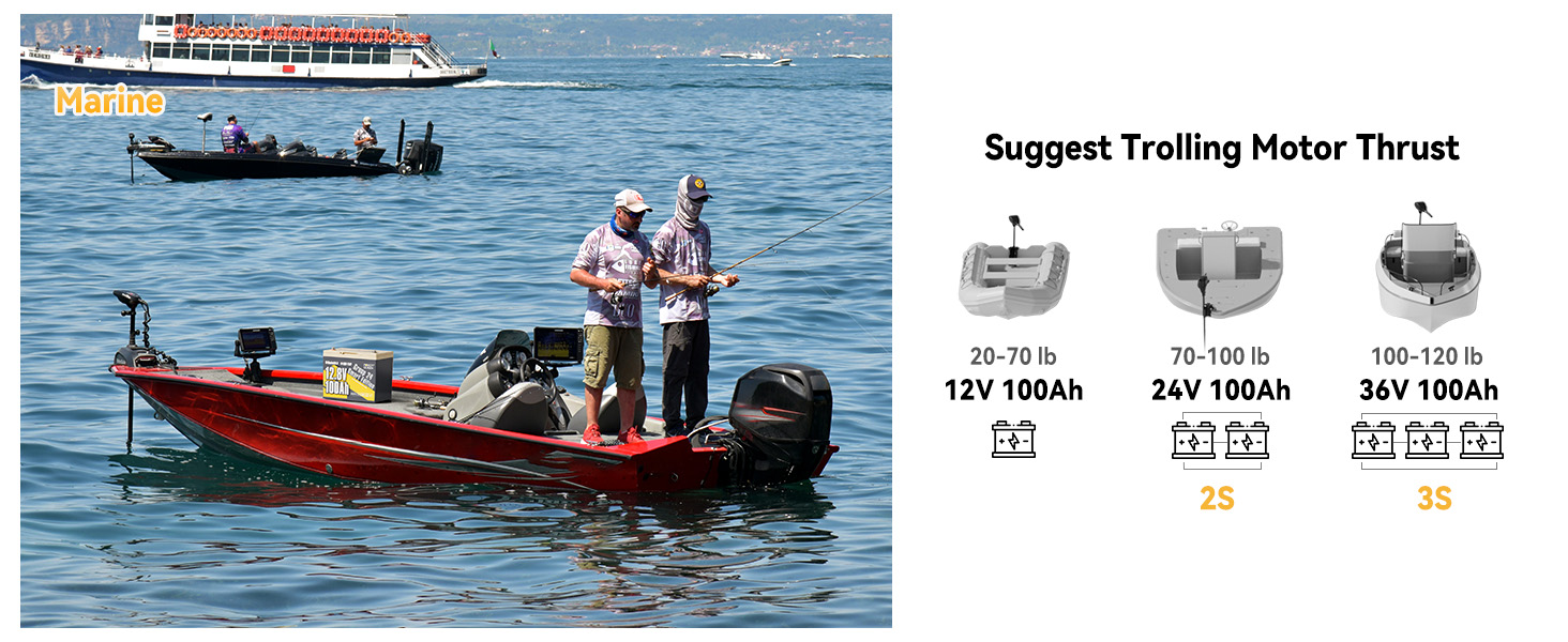 [Alimentation fiable pour moteurs électriques]Bénéficiez de performances améliorées et d'une protection robuste avec la batterie Smart Group24. Dotée d'un courant de décharge maximal de 500 A/1 S, elle gère les fortes surtensions et offre une flexibilité d'utilisation pour différents moteurs électriques (12 V : 13,6 à 32,8 kg, 24 V : 32,8 à 45,4 kg, 36 V : 45,4 à 54,4 kg). Le BMS amélioré offre une excellente résistance à l'humidité et aux embruns, garantissant une alimentation durable pour vos sorties de pêche.